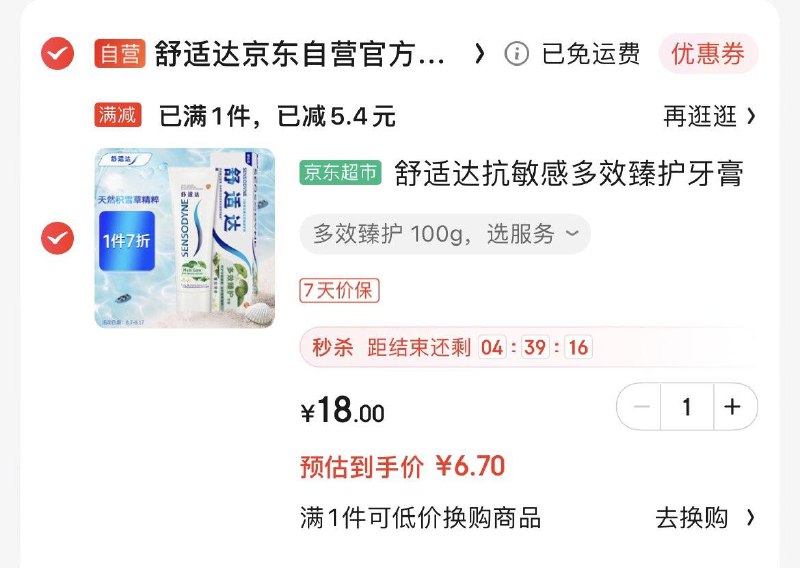 舒适达牙膏如有6-5券plus6.7+邮
