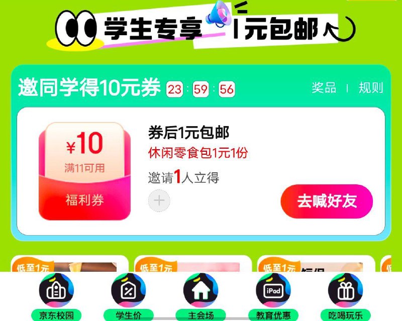 学生号页面可邀请一人助力得10券