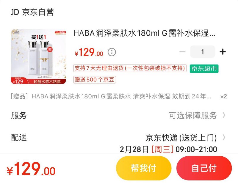 haba柔肤水129亓 部分地区买1赠2自辨