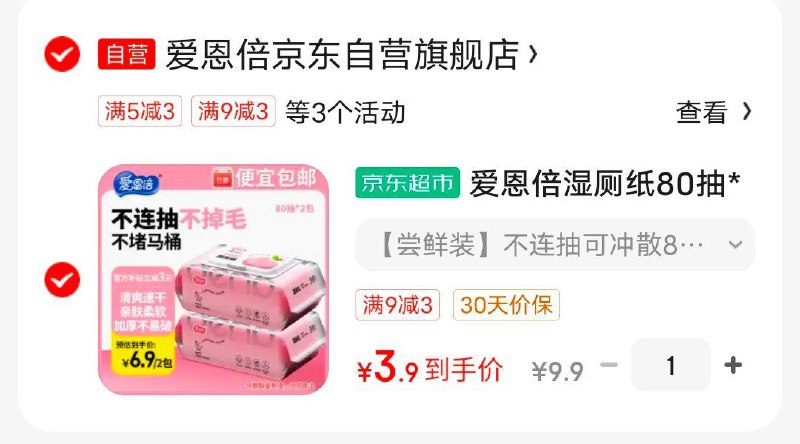 爱恩倍湿厕纸80抽2包,3.9